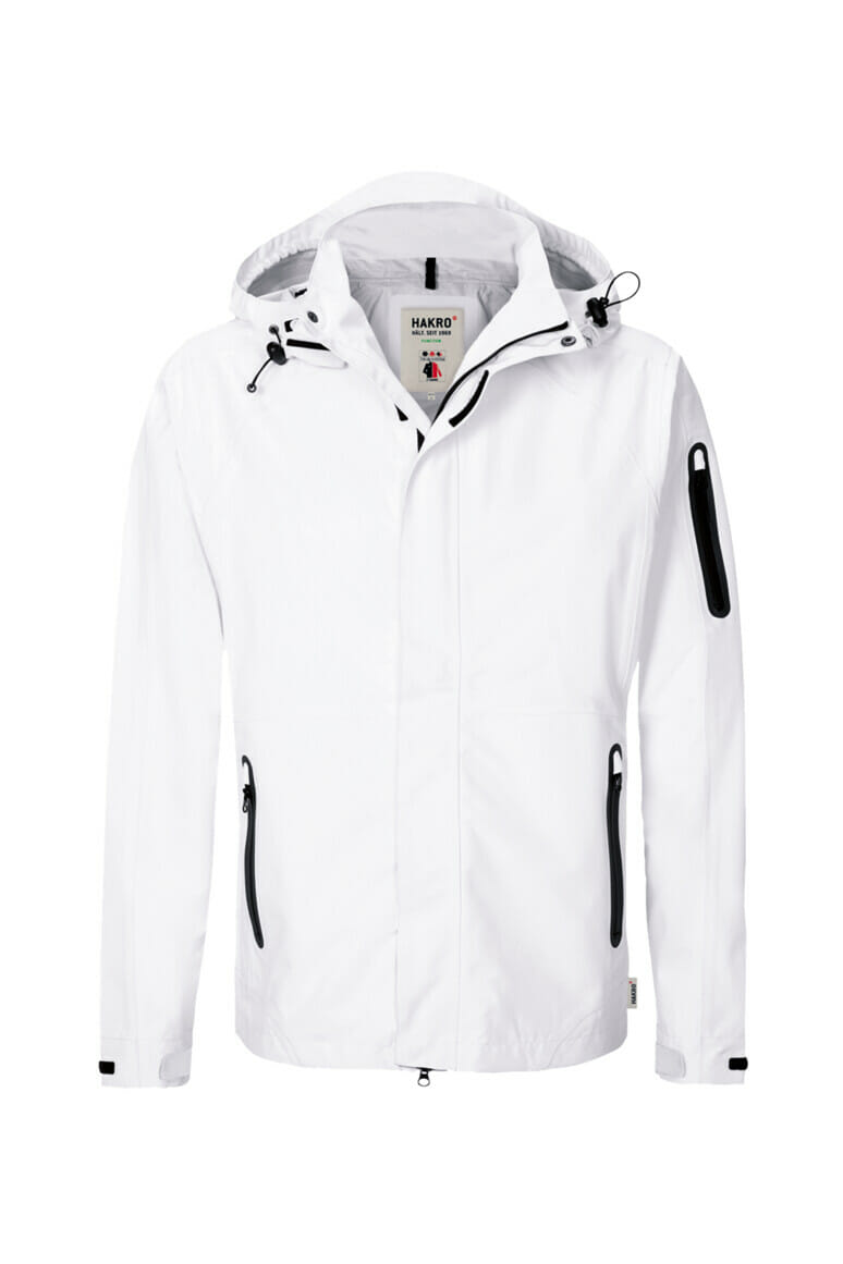 Atmungsaktive, wasser- und winddichte Aktivejacke mit getapten Nähten, abnehmbarer und regulierbarer Kapuze mit Schild, verlängertem, abgerundetem Rückenteil, hochwertigem Zwei-Wege-Frontreißverschluss mit Windschutzpatte und Reißverschlussgarage, wasserdichten Reißverschlüssen an den Taschen und Reißverschlussärmeltasche. Alle Reißverschlüsse von YKK®. Weitenverstellbarer Saumabschluss mit Tunnelkordelzug und Stoppern, weitenverstellbare Ärmelbündchen mit Klettband zum stufenlosen Regulieren. Hergestellt aus strapazierfähigem wasser- und winddichtem Obermaterial aus 2,5-Lagen-Laminat mit TRIACTIVE PRO Technologie für maximale und zuverlässige Wasserdichtigkeit. Gewebtes HAKRO Necklabel aus hochwertigem Kettsatin mit weichen, ultraschallgeschnittenen Bandkanten für höchsten Tragekomfort und gewebtes HAKRO Flaglabel an der linken Seitennaht.
